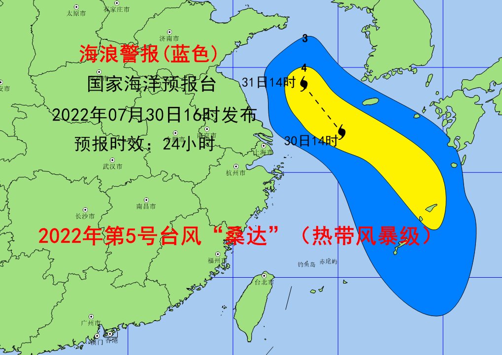 海浪方面,预计7月30日夜间至31日白天,东海、黄海南部将出现3到4.5米的大浪到巨浪区,山东半岛东部、江苏南部、上海、浙江北部近岸海域将出现1.5到2.5米的中浪到大浪。近岸海域海浪预警级别为蓝色。