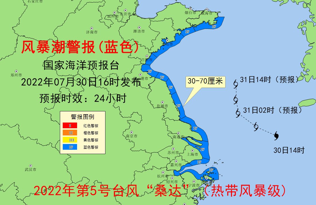 记者从自然资源部了解到,受台风“桑达”的影响,预计7月30日下午到31日下午,山东半岛南部至杭州湾沿海将出现30到70厘米的风暴增水。浙江省宁波市、舟山市和山东省日照市的风暴潮预警级别为蓝色。