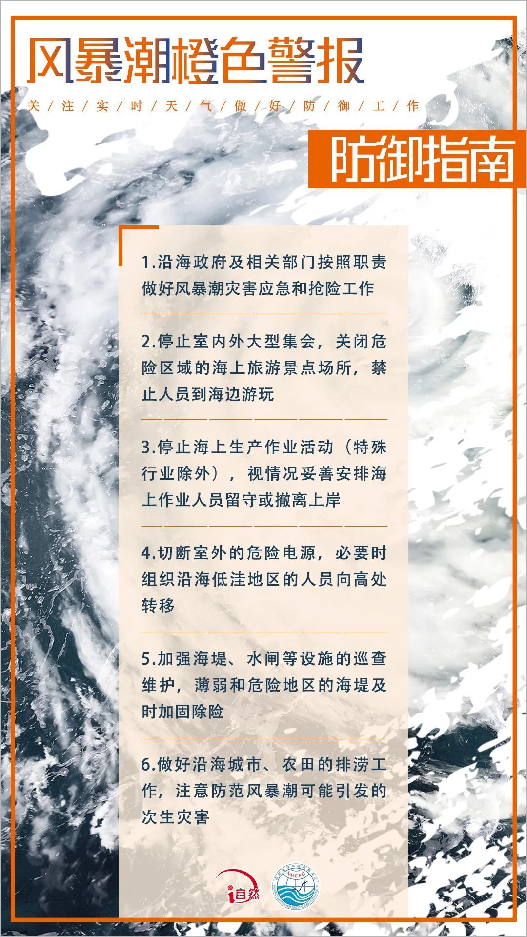 预计9月14日上午到15日上午,江苏连云港至南通沿海将出现60到150厘米的风暴增水,长江口至浙江宁波沿海将出现100到280厘米的风暴增水,浙江台州至温州沿海将出现50到100厘米的风暴增水。上海市和浙江省嘉兴市、绍兴市、宁波市和舟山市的风暴潮预警级别为橙色 ,浙江省台州市的风暴潮预警级别为蓝色。 请沿海政府及相关部门按照职责做好防御风暴潮的应急抢险工作;组织各类船只回港避风,加固沿海渔业养殖水产设施和渔港设施,相关海上作业人员及时撤离;关闭沿海危险区域浴场和游乐设施,禁止人员到海边游玩;加强沿海海堤、水闸等设施的巡查,薄弱地区和危险地区的海堤及时加固除险,必要时,相关人员撤离转移到安全地带。